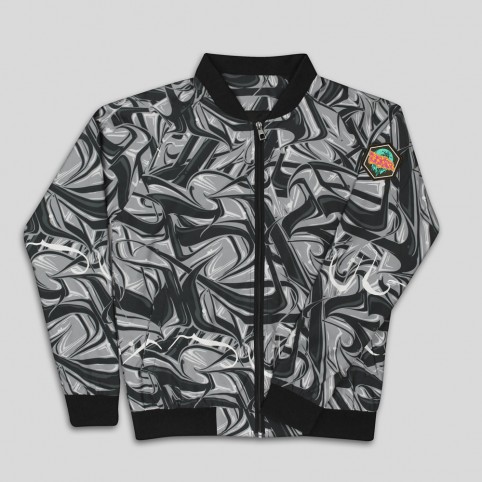 Veste imprimée avec l’œuvre de l’Artiste (700g) : Série Limitée, 80 Pièces. Écusson Logo en Gomme PVC 3D. 100% Polyester, doublure en Velours. Col montant côtelé, poignets élastiques et ourlet élastique (75% Rayonne, 25% Elasthanne). Fermeture principale à glissière, deux poches extérieures.Lavage 30°C Max.