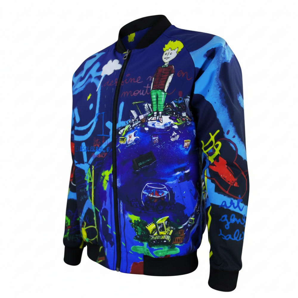 High ribbed collar, elastic cuffs and elastic hem (75% Rayon, 25% Spandex).